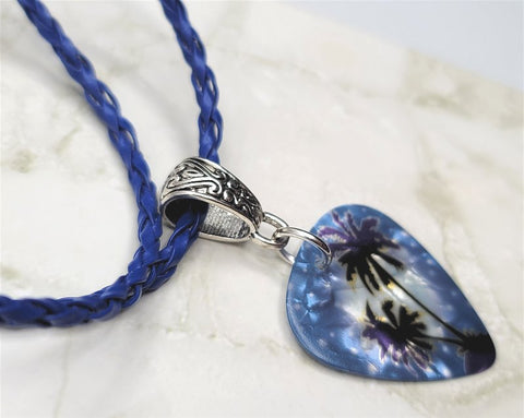 This necklace is made with a palm tree guitar pick. The style reminds me of those pictures you see at the airbrushing booths at fairs and stuff, and I love it! I also used a blue braided cord.