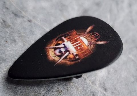 This lapel pin or tie tack is made with a Pantera guitar pick. It is a real guitar pick.