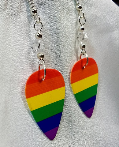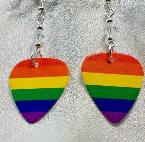 These perfect earrings are made with rainbow pride guitar picks. Between the guitar pick and the earwire I used a 6mm clear genuine Swarovski crystal bicone on each earring.