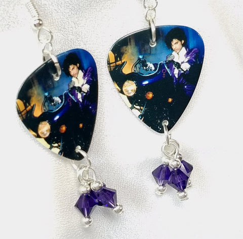 These are made on Prince Purple Rain guitar picks. The front side if the cover of the album, and the back of the picks are black with Prince's symbol in purple. I dangled three purple velvet colored 6mm genuine Swarovski crystal bicones from each earring.