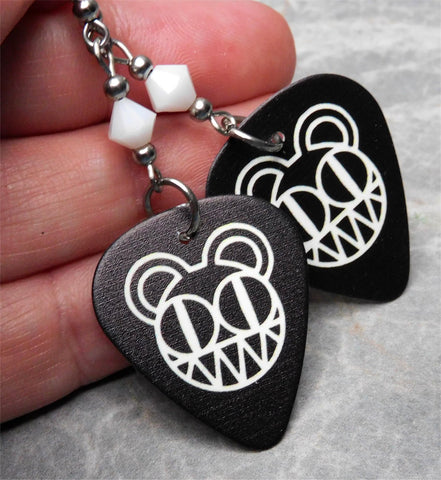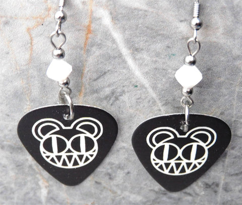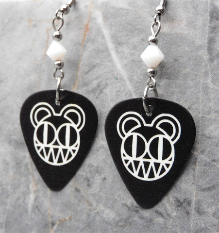 These are made with Radiohead logo black guitar picks. The picks have the graphics on one side. Between the guitar pick and the earwire I used a white alabaster 6mm genuine Swarovski crystal bicone on each earring.