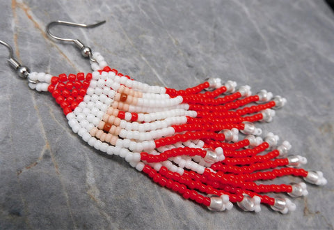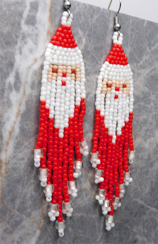 I hand stitched these long whimsical Santa Claus brick stitch earrings. Except for the larger beads at the end of the tassels the seed beads are all glass and size 11/0. The larger ones are white lined clear 6/0 glass beads. This Santa has brown eyes.
