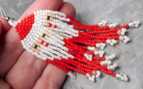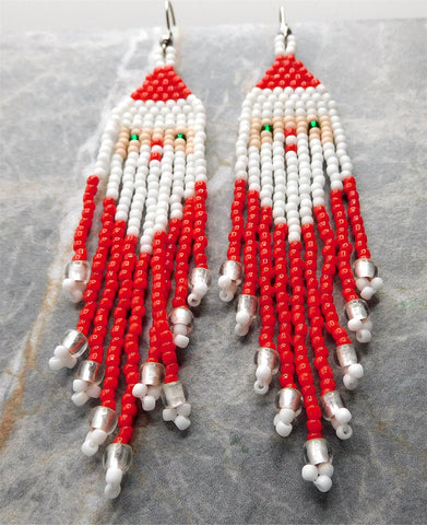 I hand stitched these long whimsical Santa Claus brick stitch earrings. Except for the larger beads at the end of the tassels the seed beads are all glass and size 11/0. The larger ones are white lined clear 6/0 glass beads. This Santa has green eyes.