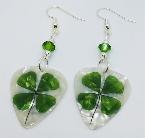 These earrings are made on white MOP guitar picks printed with a shamrock or four leaf clover. Between the guitar pick and the earwire I used a green 6mm genuine Swarovski crystal bicone on each earring.