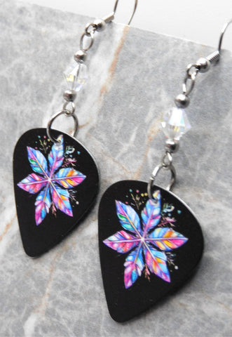 These earrings are made on black guitar picks with a beautiful snowflake printed on them. Between the guitar pick and the earwire I used a 6mm clear ABx2 genuine Swarovski crystal bicone on each earring.