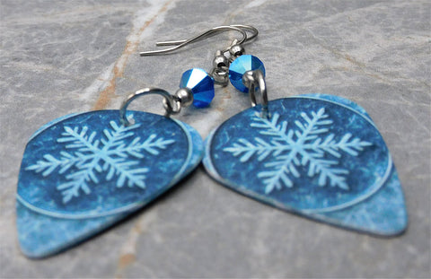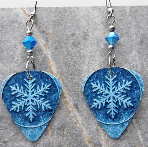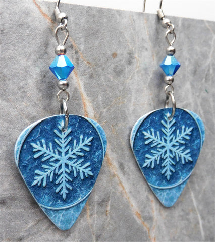 These blue earrings are made with guitar picks that have a beautiful snowflake. Between the guitar pick and the earwire I used a blue ABx2 6mm genuine Swarovski crystal bicone on each earring.