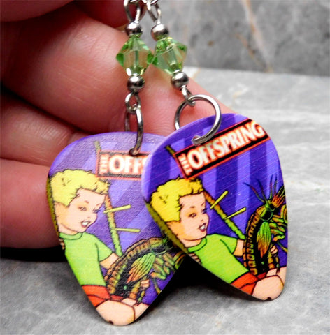 These earrings are made with The Offspring Americana guitar picks. Between the guitar pick and the earwire I used a 6mm green genuine Swarovski crystal bicone on each earring.