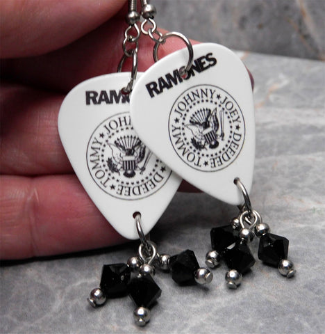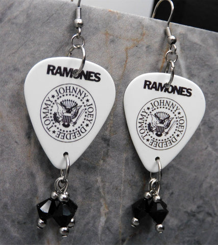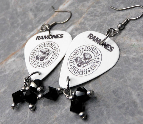 The Ramones Logo White Guitar Pick Earrings with Black Swarovski Crystal Dangles