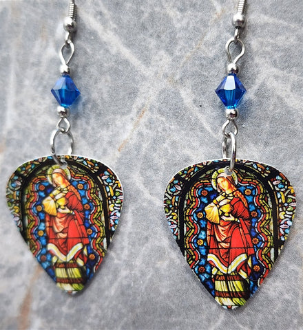 Virgin Mother Mary Stained Glass Guitar Pick Earrings with Capri Blue Swarovski Crystals