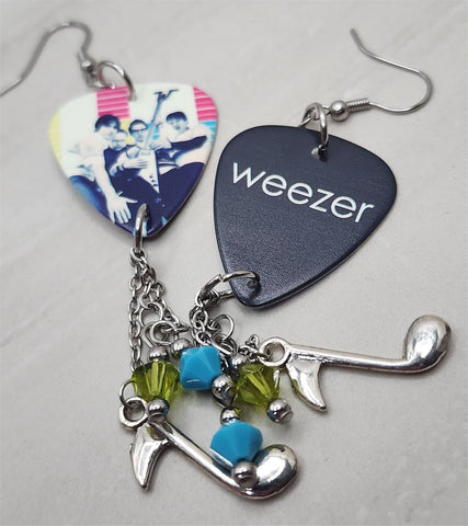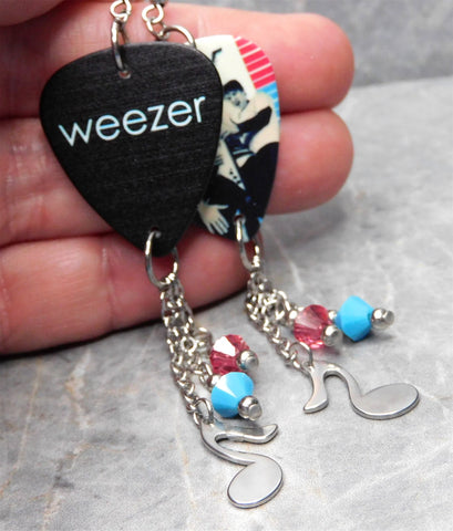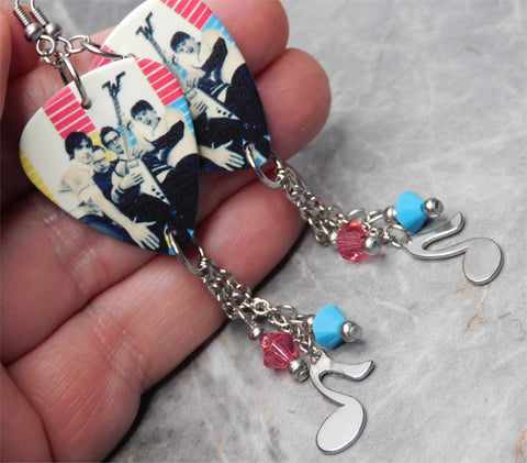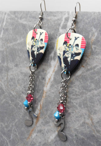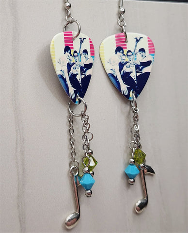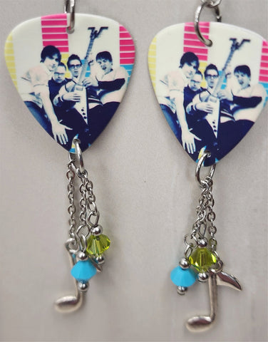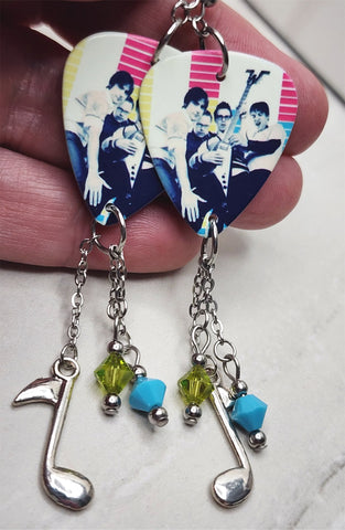 Weezer Group Picture Guitar Pick Earrings with Music Note Charm and Swarovski Crystal Dangles