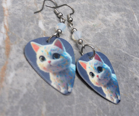 White Cat With Subtle Designs Guitar Pick Earrings with White Opal Swarovski Crystals